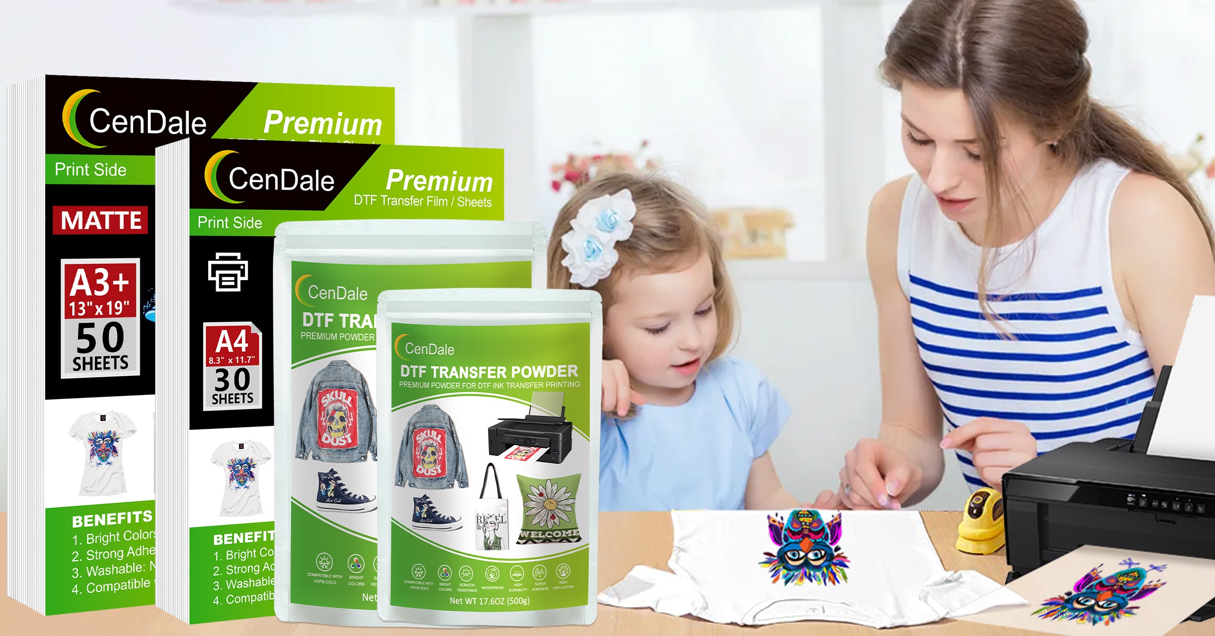 CenDale DTF Transfer Film and Powder Starter Kit for DTF & Sublimation Printer - 30 Sheets A4 Film 14oz White Medium Powder