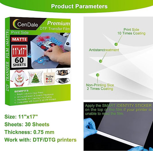 CenDale DTF Transfer Film 11"x17" - 30 Sheets Double-Sided Matte PET Heat Transfer Paper