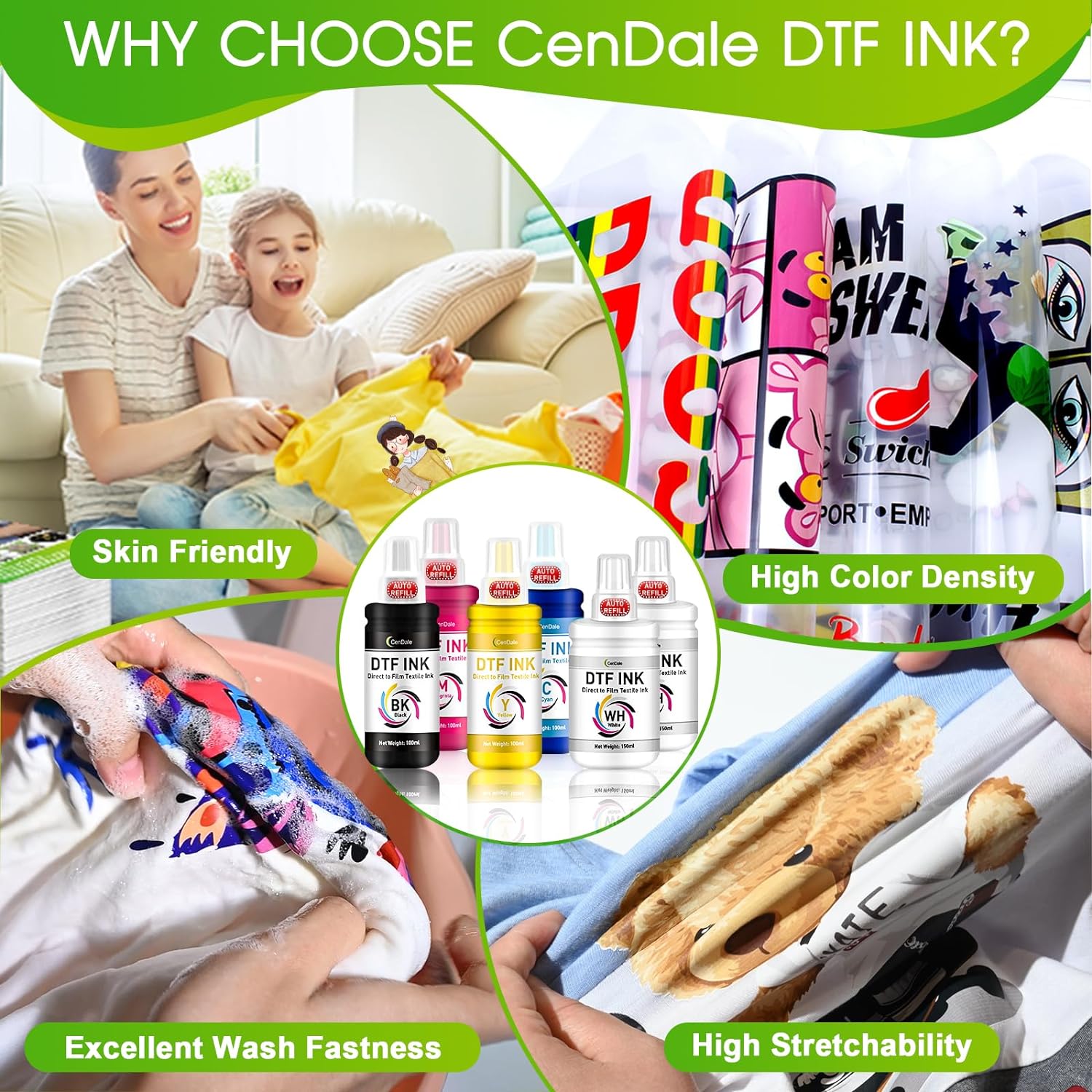 - ✅ 【COMPATIBILITY】Unlock the world of DTF printing with our ink. For DTF printers and all 6 and 8 color Epson printers that can be converted to DTF with cadlink software. For Epson ET-8550, ET8500, XP15000, XP600, L1800, L800, 1430, P400/P408, P600/P608, P800, R1390, R1800, R1900, R2000, R2400, R2880, R3000, 3880, 4880, 7880 printer etc. Perfectly complemented by CenDale DTF transfer film and DTF powder. Elevate your creative projects and business printing with ease.