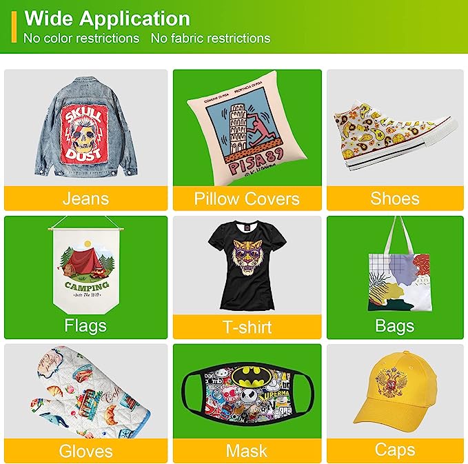 - ✅ 【EASY TO US】 No PreTreat, you can create, print and cut to size you want NO WEEDING. You can print on non-treated cotton, Jeans,silk, polyester, denim, nylon,Lycra, leather, blends, and many other material.