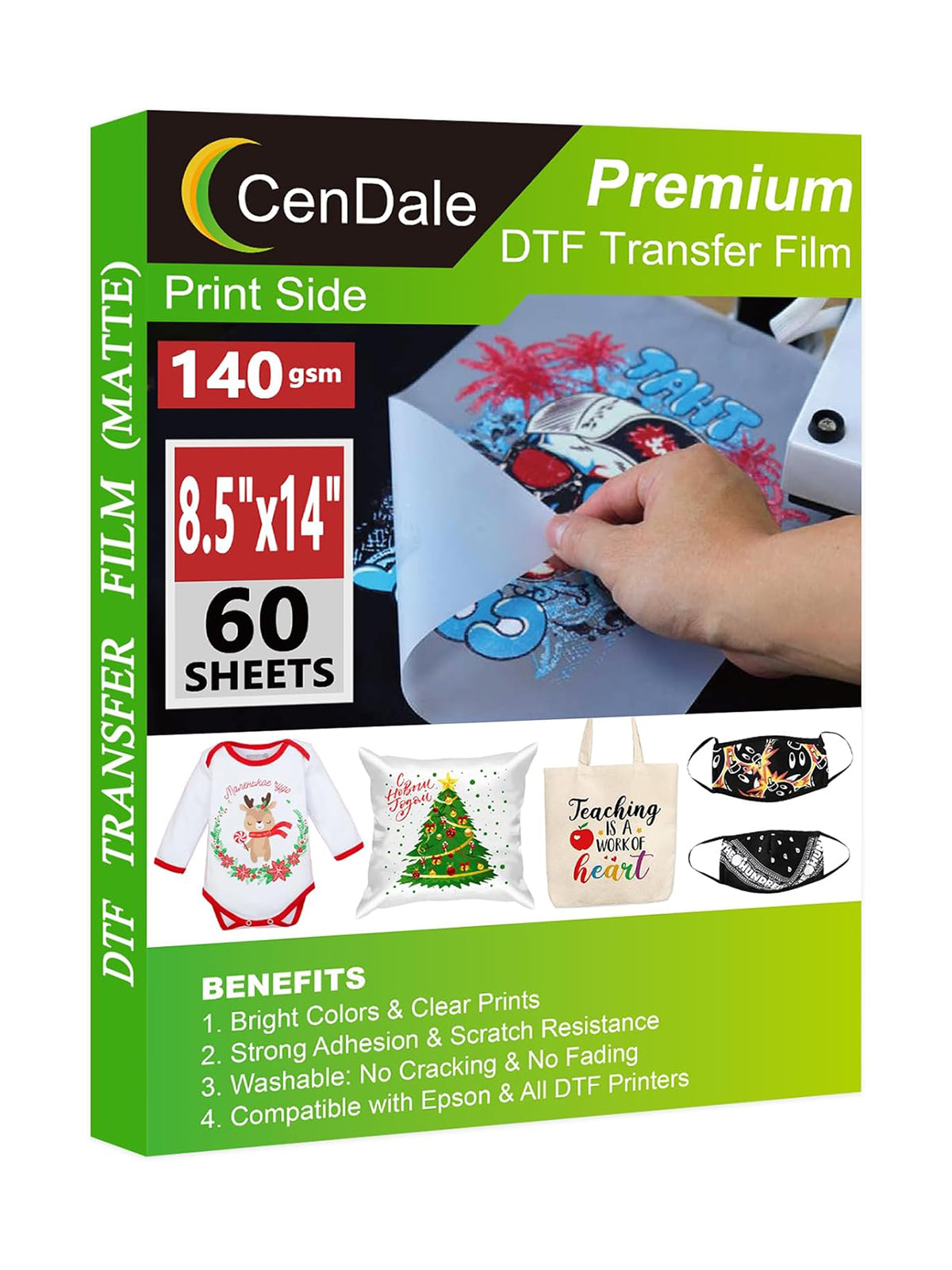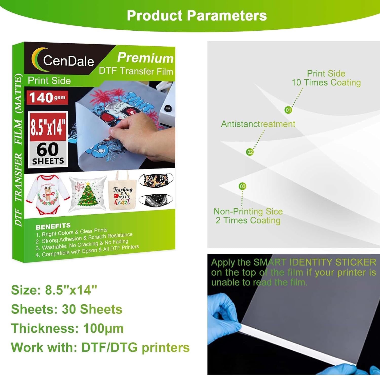 - ✅ 【VIBRANT AND CRISP DESIGNS】CenDale Upgraded formula DTF film 8.5"x14" adopts German matte film and anti-static coating technology. Compatible with all DTF and sublimation printers. Uniquely engineered for DTF sublimation hack. More thicker than usual standards. Strong ink absorption ability, 100% printing the color of original image colors. With a non-stick film surface, powders won't cling. Patterns release flawlessly during peeling, leaving you with pristine designs.