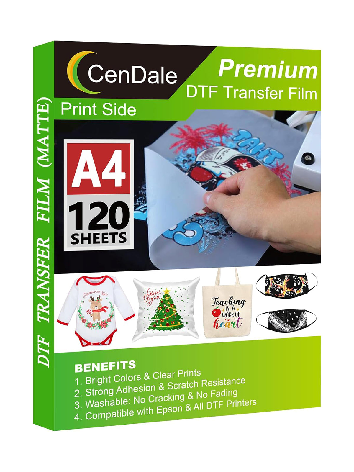 - ✅ 【VIBRANT AND CRISP DESIGNS】CenDale Upgraded formula DTF film A4 adopts German matte film and anti-static coating technology. Compatible with all DTF and sublimation printers. Uniquely engineered for DTF sublimation hack. More thicker than usual standards. Strong ink absorption ability, 100% printing the color of original image colors. With a non-stick film surface, powders won't cling. Patterns release flawlessly during peeling, leaving you with pristine designs.