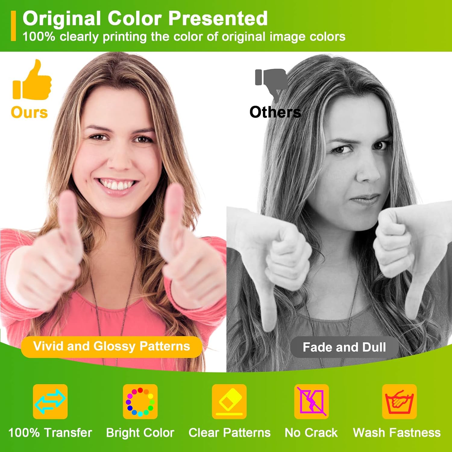 - ✅【EXCEPTIONAL QUALITY AND DURABILITY】5 layers coating process for better ink absorption for fuller prints, allowing for brilliant color-rich transfers. The glossy reverse side features an anti-slip layer, ensuring seamless printer feed. Enjoy excellent washability and resistance to stretching. Plus, the film can be conveniently stored for future use.