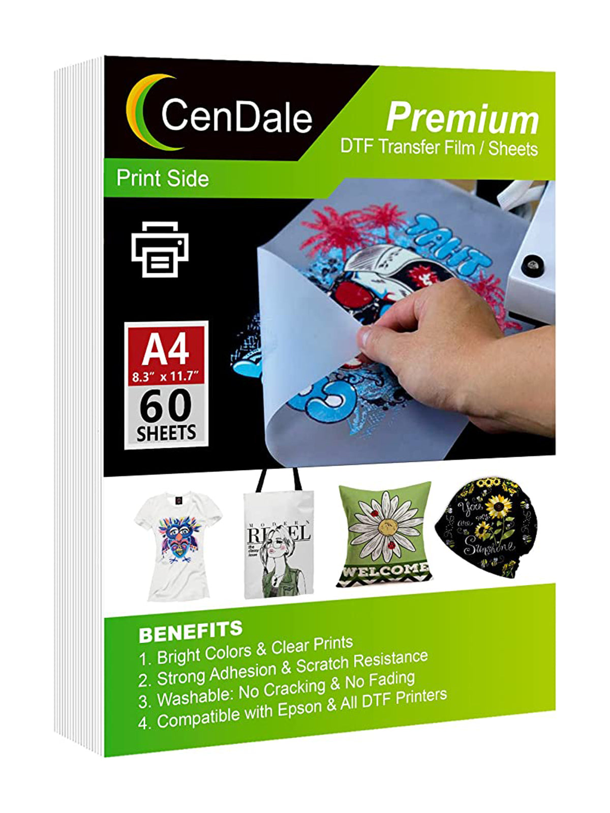 - ✅ 【WIDE COMPATIBILITY】NO color restrictions, NO fabric restrictions and both light and dark fabrics can be printed on. DTF transfer film, which can be printed on cotton, polyester, synthetic, and blended textile. PLEASE NOTE: in order to use CenDale DTF transfer film, you will need DTF printer, DTF Ink and DTF Powder.