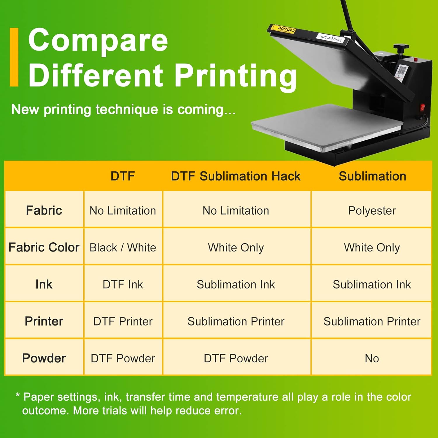 - ✅ 【WIDE COMPATIBILITY】Direct Transfer Printing is a revolutionary new technique that’s more affordable and accessible. DTF printing could work onto non-treated cotton, silk, polyester, nylon, leather and more, with no color or fabric restrictions. No Pre-treated, you can create, print and cut to size you want No weeding. Note: If using DTF sublimation hack, only white fabrics are compatible due to the lack of white ink.