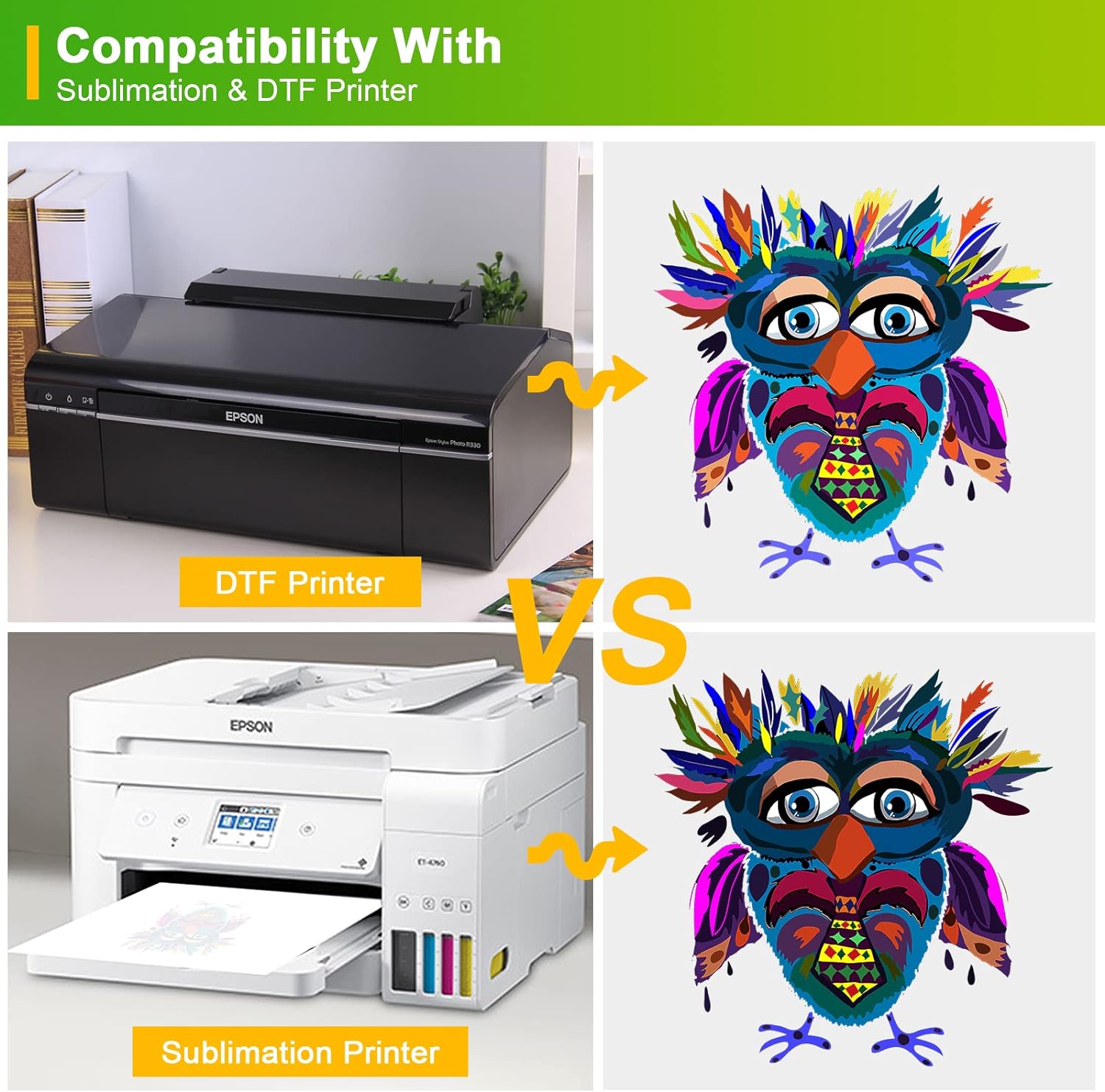 - ✅ 【UPGRADED FORMULA FOR DTF SUBLIMATION HACK】Our DTF film adopts matte film and German anti-static coating technology to ensure strong ink absorption and 100% original image color printing. The pattern falls off completely when peeling, and the powder won't stick to the film. Compatible with all DTF and sublimation printers.
