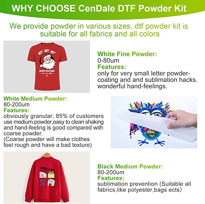- ✅ 【DTF POWDER KIT】CenDale dtf transfer powder include White Super-Fine Powder(70g), White Medium Powder(200g), Black Medium Powder(100g). DTF powder can be printed on non-treated cotton, Jeans,silk, polyester and many other material.