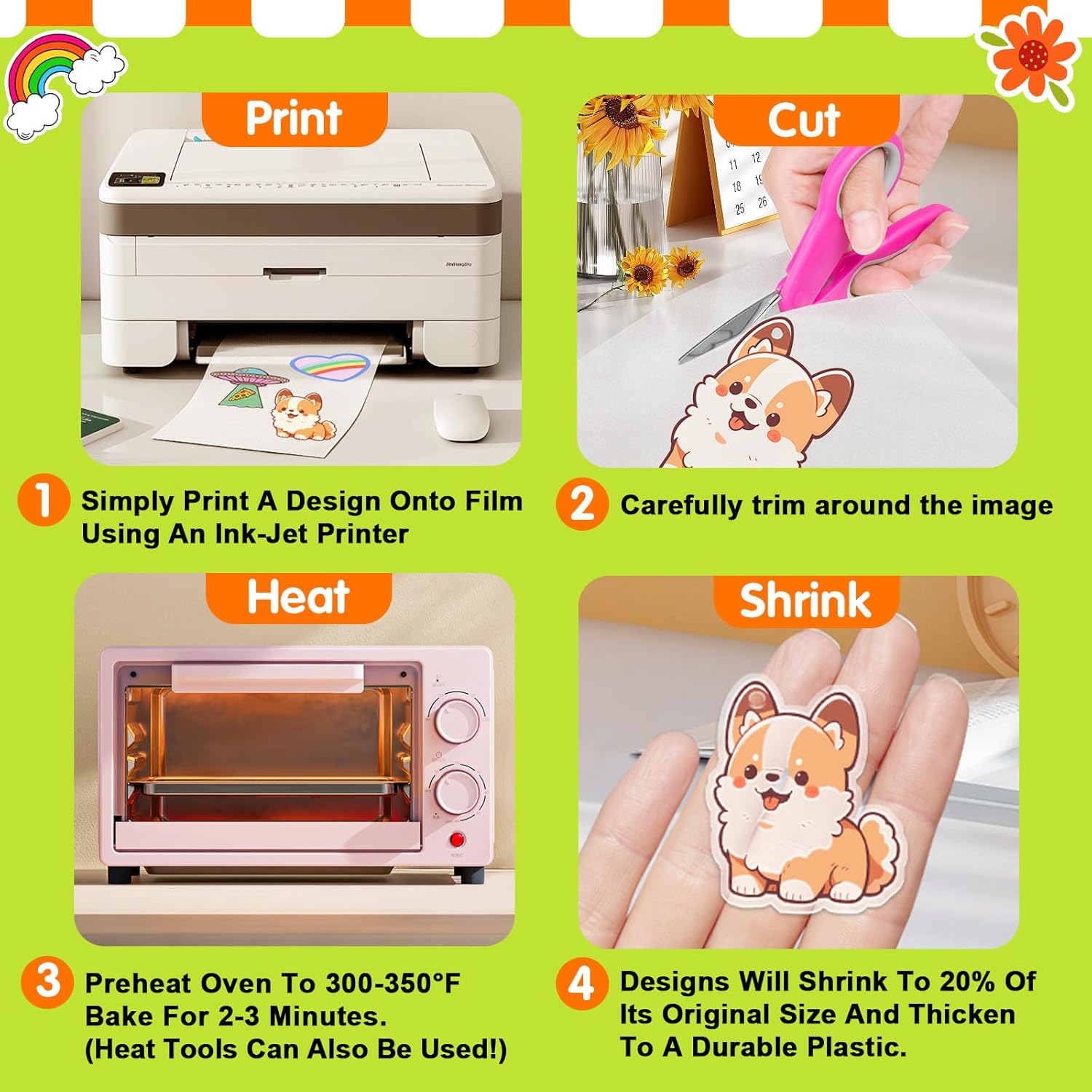 - ✅【PREMIUM PRINTABLE SHRINK PLASTIC】Made with high-quality, non-toxic, odor-free material that resists warping and ensures even heat distribution during shrinking. The material remains flat and smooth throughout the process, giving you perfectly uniform results. Finished designs boast high transparency, crisp details, and long-lasting durability, ensuring your creations look professional and stay vibrant over time. Each pack also includes a detailed instruction, offering step-by-step guidance on how to use the sheets.