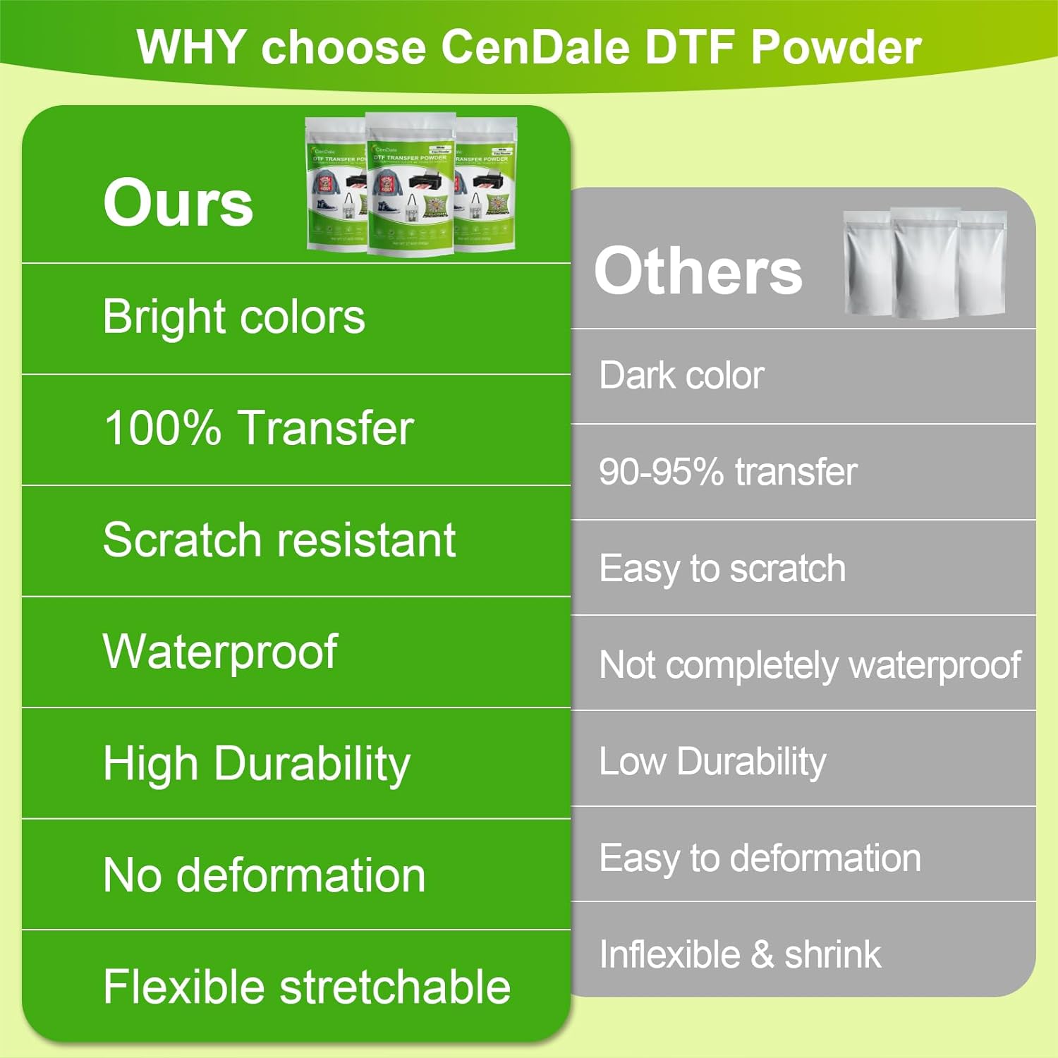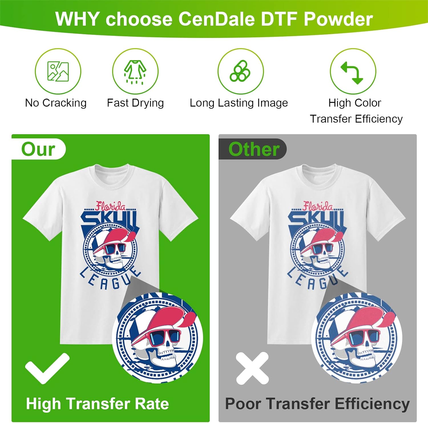 - ✅ 【Waterproof & High Durability】DTF hot melt adhesive powder eliminates the need for preteatment. This DTF hot melt powder is 0-80um. And CenDale DTF Powder won't clog your automatic shaker with excellent bonding, Waterproof and flexibility.Work with both hot and cold peel PET films for high production output.