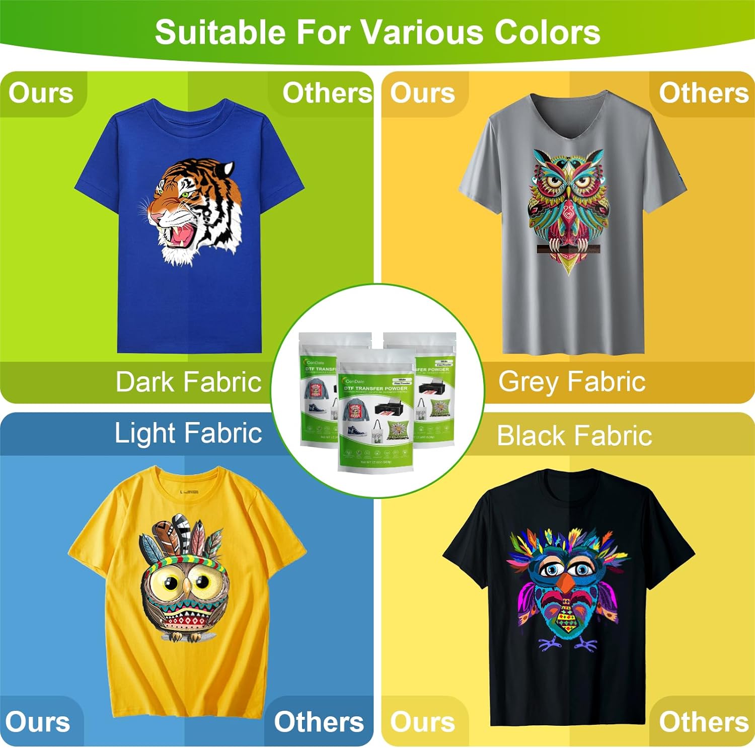 - ✅ 【Bright Colors & High Quality】 The DTF Powder will stick to the ink instead of the dtf film, provide bright, vivid color. DTF hot melt powder for DTF transfer inks and dtf films is a TPU material that is soft and elastic to the touch and provides high adhesion.
